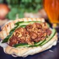 Lekker broodje gevuld met kipsaté en zelfgemaakte pindasaus, met gebakken uitjes